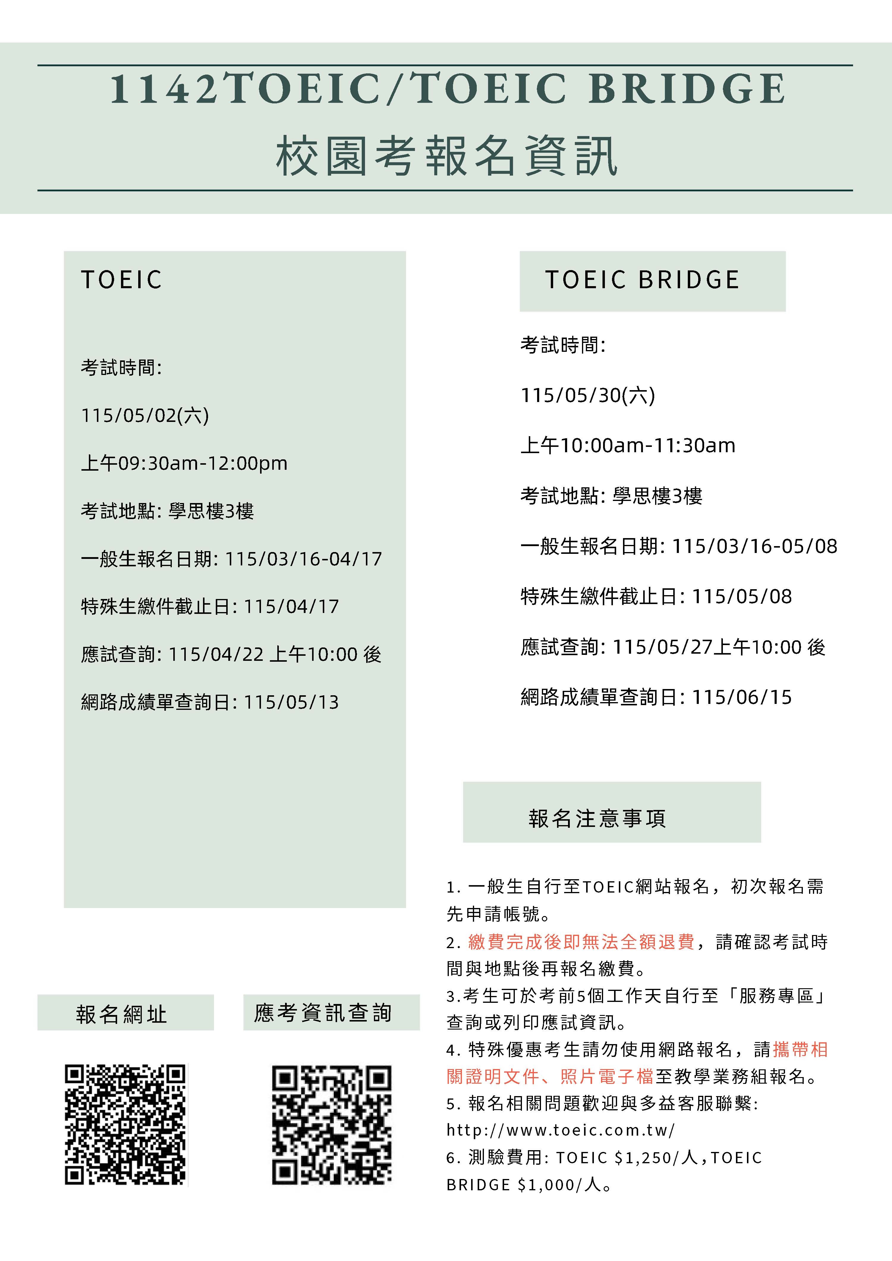 1142 TOEIC / TOEIC BRIDGE 校園考名資訊