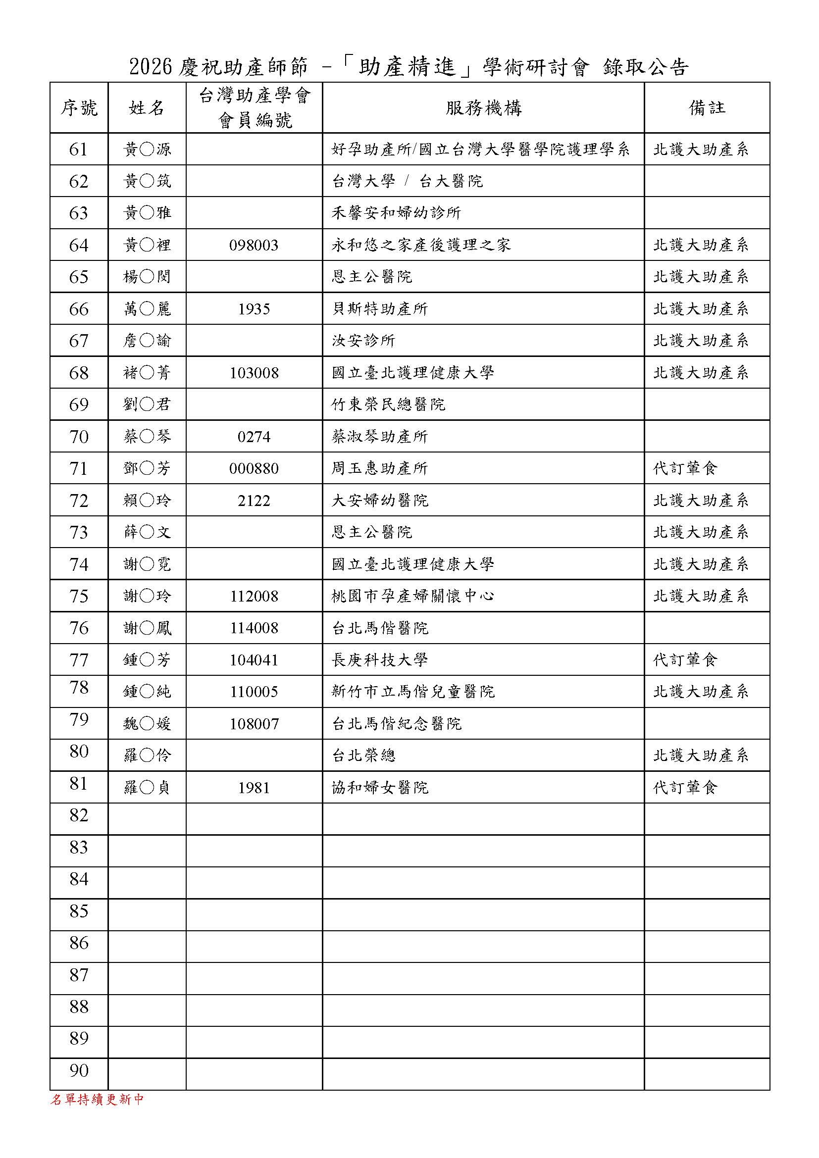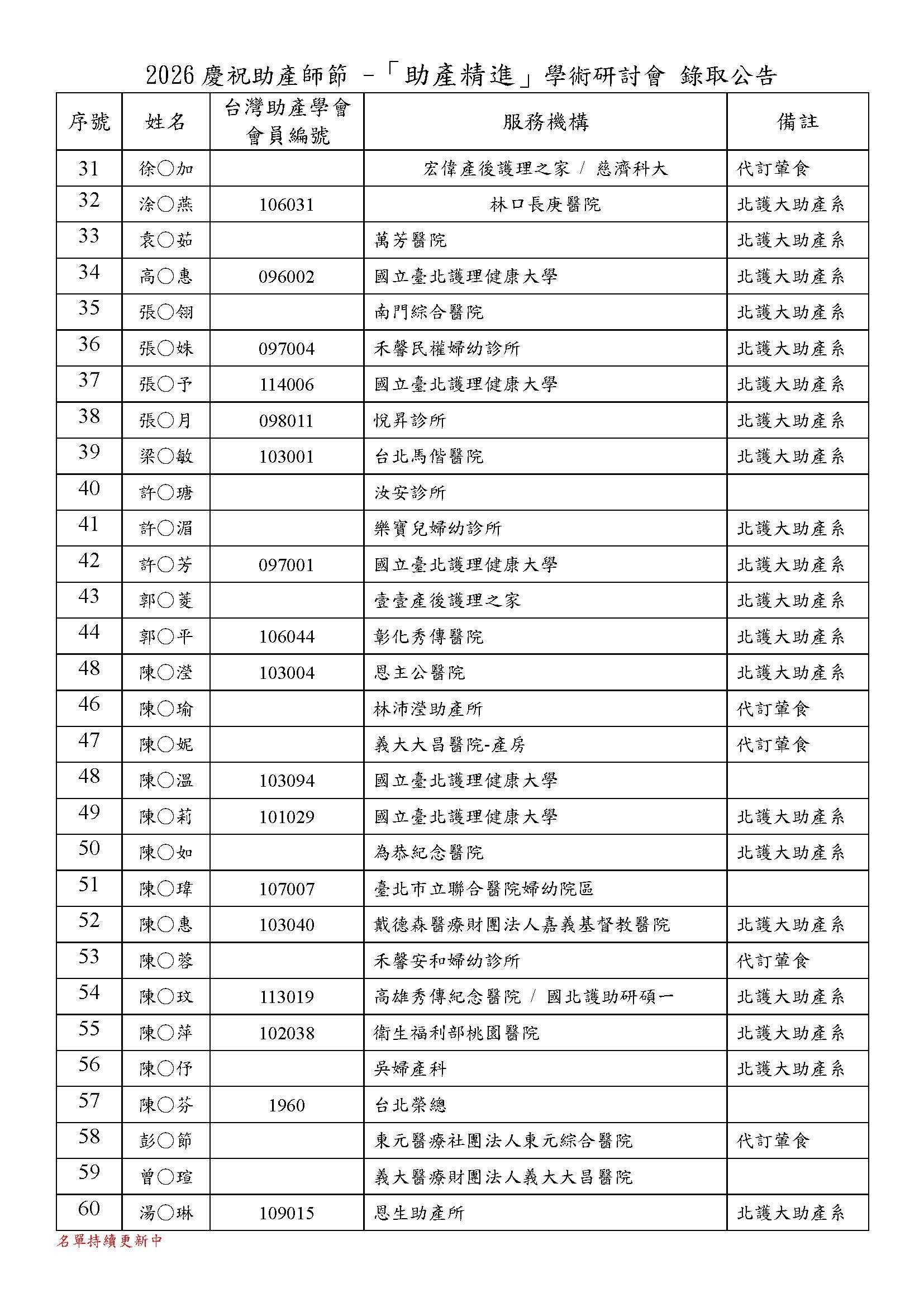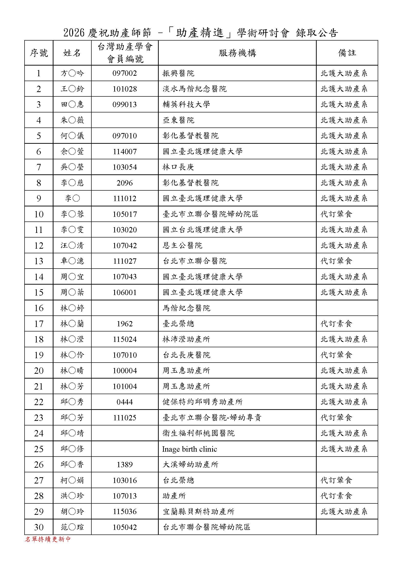 2026慶祝助產師節-助產精進學術研討會名單錄取結果公告